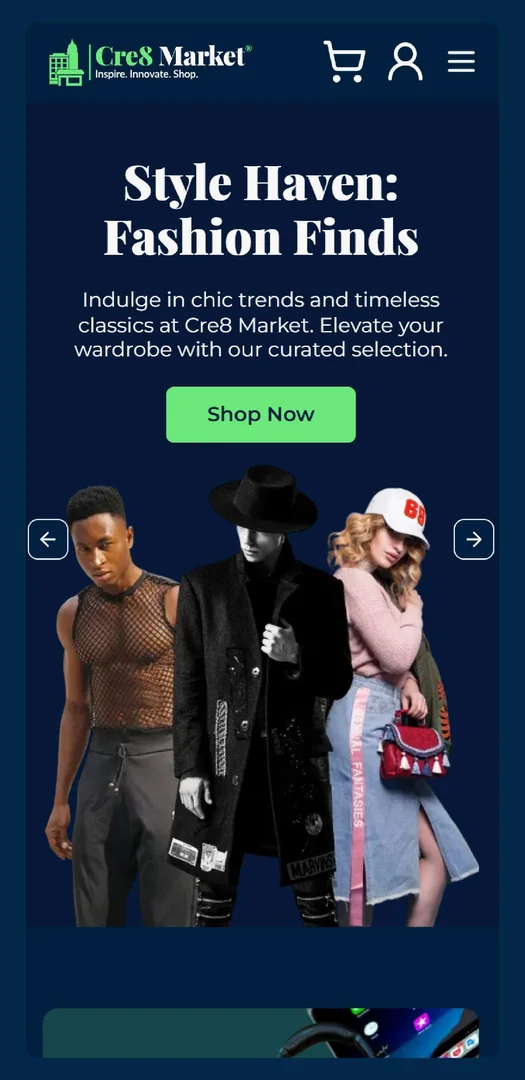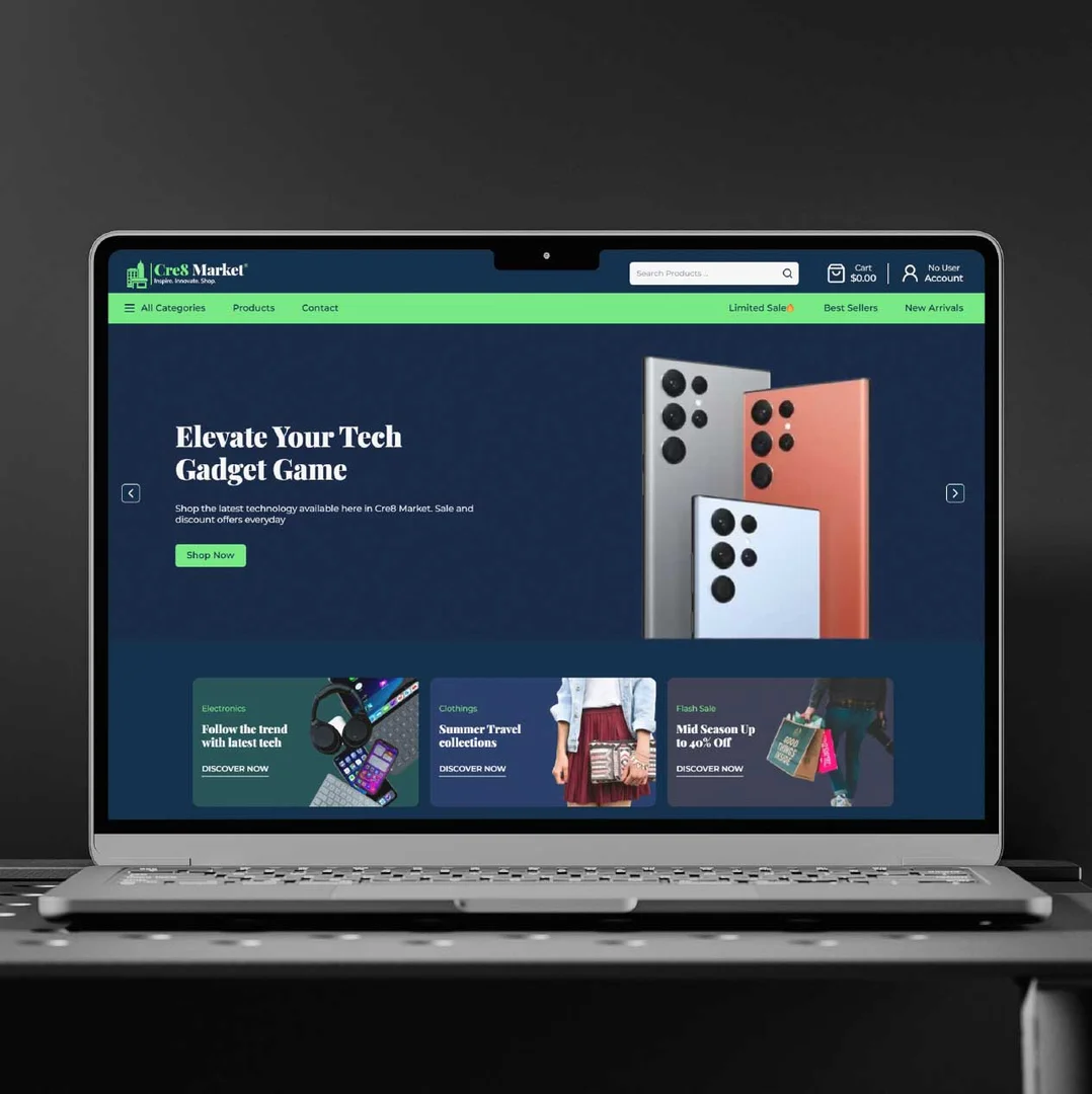 Cre8 Market is a dynamic, user-friendly online marketplace offering a vast array of products across categories including electronics, fashion, home goods, health & beauty, and more. Whether you're shopping for the latest gadgets, stylish clothing, household essentials, or unique gifts, Cre8 Market brings you high-quality products at competitive prices. It came to us for it's brand identity, graphics design, website design and development